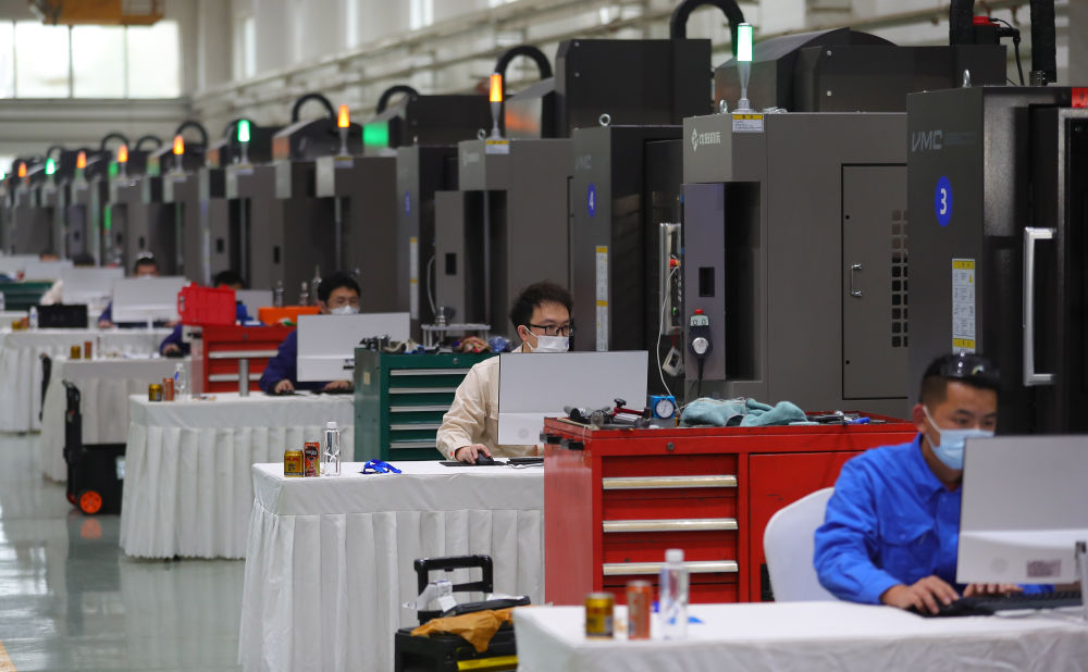 參賽選手在在2022“一帶一路”暨金磚國(guó)家技能發(fā)展與技術(shù)創(chuàng)新之“通用技術(shù)杯”數(shù)控多軸加工大賽中比拼(2022年11月10日攝)。新華社記者 楊青 攝