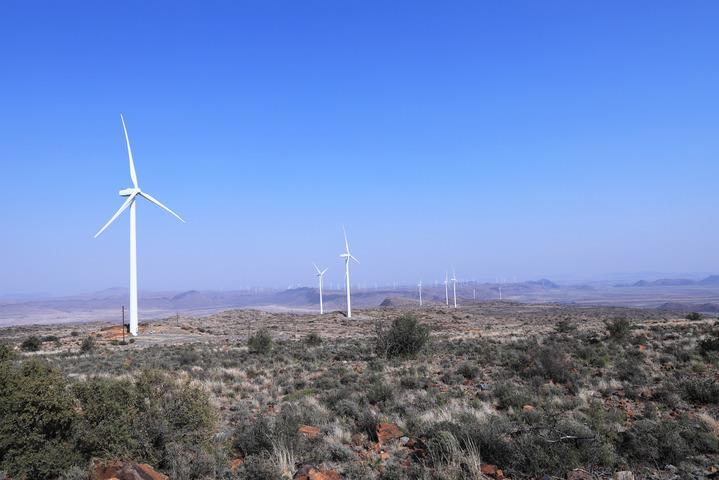 這是8月10日在南非北開(kāi)普省德阿鎮(zhèn)拍攝的中國(guó)國(guó)家能源集團(tuán)龍?jiān)措娏δ戏枪具\(yùn)營(yíng)的德阿風(fēng)電項(xiàng)目風(fēng)機(jī)。新華社記者 董江輝 攝