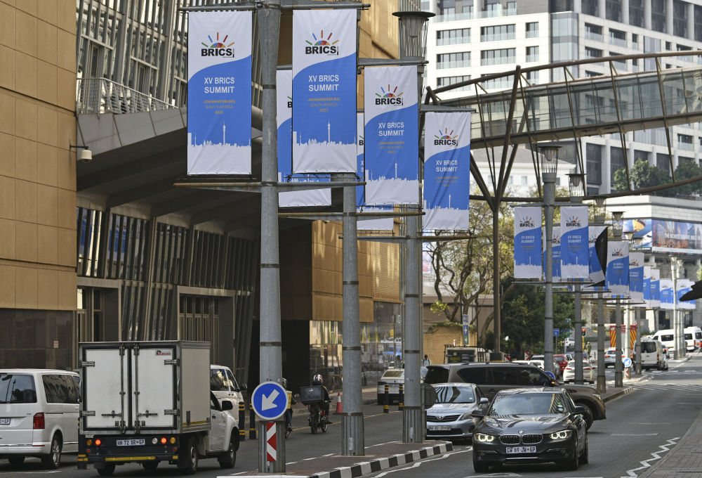 這是8月17日在南非約翰內(nèi)斯堡拍攝的金磚峰會(huì)條幅。金磚國(guó)家領(lǐng)導(dǎo)人第十五次會(huì)晤將于南非約翰內(nèi)斯堡舉行。新華社記者 陳誠(chéng) 攝