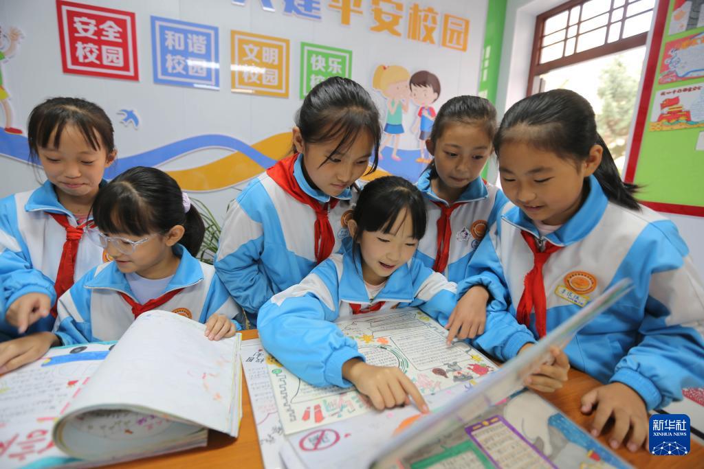 9月11日,甘肅省定西市安定區(qū)東關(guān)小學(xué)的學(xué)生利用手抄報學(xué)習(xí)網(wǎng)絡(luò)安全相關(guān)常識。(新華社發(fā) 王克賢 攝)