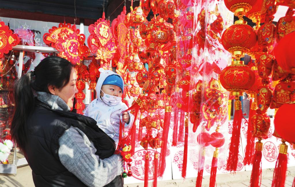 近日,在原平市小集鎮(zhèn)批發(fā)市場(chǎng),人們紛紛選購(gòu)大紅“福”字、紅燈籠、中國(guó)結(jié)、春聯(lián)、生肖虎元素的節(jié)日喜慶物品,紅紅火火迎接新春佳節(jié)。 (褚 震 攝)