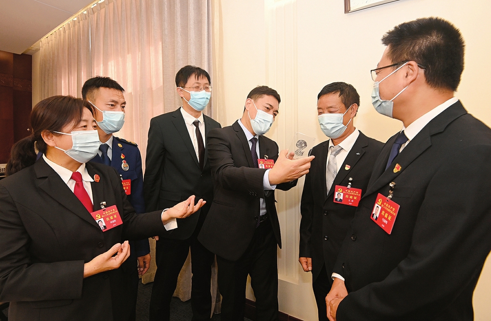 10月18日,出席黨的二十大的山西團(tuán)代表田亞欣、張高峰、張靖、牛國(guó)棟、王春、馬黎明(自左至右)在會(huì)議間隙圍繞創(chuàng)新是第一動(dòng)力話題展開討論。(記者李聯(lián)軍攝)