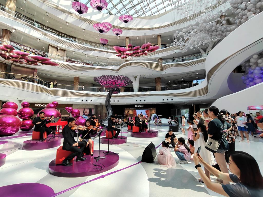 端午假期,海口國際免稅城內(nèi),伴隨著悠揚(yáng)的音樂,陽光傾瀉“天際秘林”夢幻舞臺,正在購物的游客們紛紛駐足欣賞?!耙粓鍪覂?nèi)音樂會,給購物消費(fèi)增添了新意和氛圍感?!焙?谑忻耜惱俪两陉柟夂鸵魳分?。