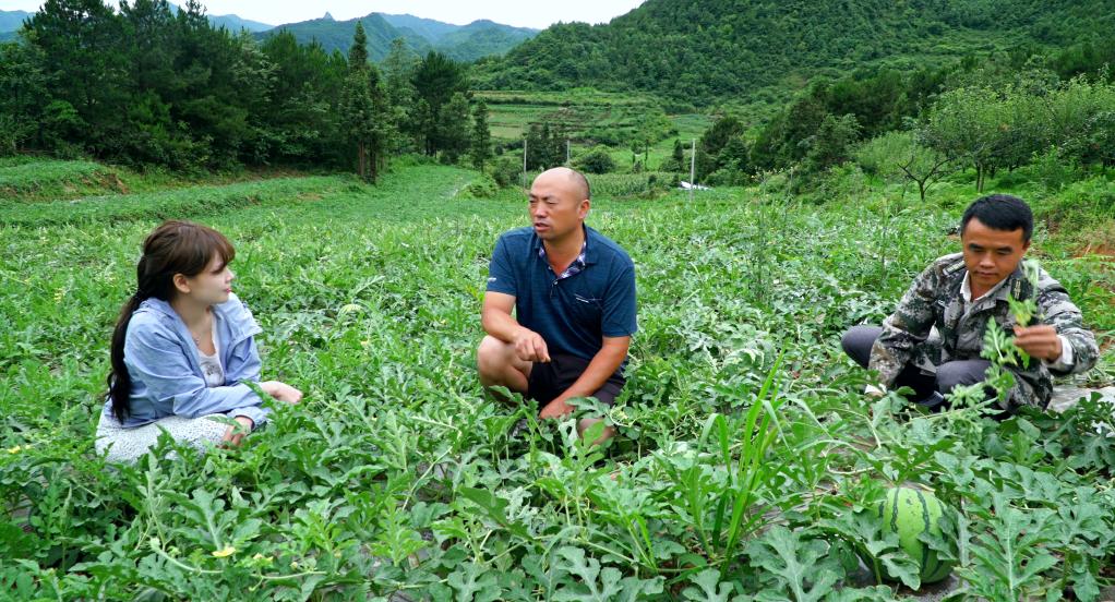 圖為貴陽市烏當(dāng)區(qū)新堡鄉(xiāng)新堡村一農(nóng)場負責(zé)人林正福查看西瓜生長情況。(韋登亮 攝)