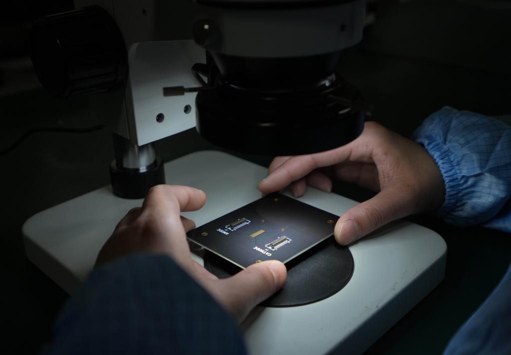 6月2日,工作人員在蘇州光電技術研究院的封裝測試公共服務平臺車間內(nèi)檢測一塊激光雷達芯片。新華社記者 李尕 攝