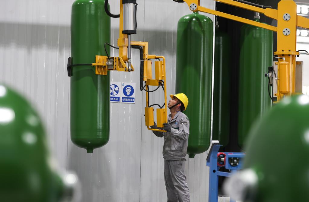 5月31日,一名工作人員在江蘇國富氫能技術裝備股份有限公司的儲氫罐生產(chǎn)車間內(nèi)作業(yè)。新華社記者 楊磊 攝