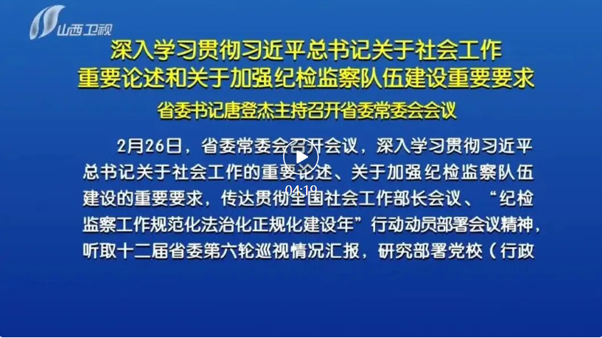 山西日?qǐng)?bào)報(bào)道 2月26日,省委常委會(huì)召開會(huì)議,深入學(xué)習(xí)貫徹習(xí)近平總書記關(guān)于社會(huì)工作的重要論述、關(guān)于加強(qiáng)紀(jì)檢監(jiān)察隊(duì)伍建設(shè)的重要要求,傳達(dá)貫徹全國(guó)社會(huì)工作部長(zhǎng)會(huì)議、“紀(jì)檢監(jiān)察工作規(guī)范化法治化正規(guī)化建設(shè)年”行動(dòng)動(dòng)員部署會(huì)議精神,聽取十二屆省委第六輪巡視情況匯報(bào),研究部署黨校(行政學(xué)院)工作。省委書記唐登杰主持會(huì)議。