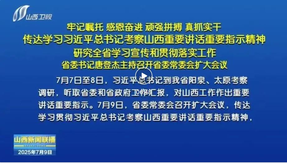 7月7日至8日,習(xí)近平總書記到我省陽(yáng)泉、太原考察調(diào)研,聽取省委和省政府工作匯報(bào),對(duì)山西工作作出重要講話重要指示。7月9日,省委常委會(huì)召開擴(kuò)大會(huì)議,傳達(dá)學(xué)習(xí)貫徹習(xí)近平總書記考察山西重要講話重要指示精神,認(rèn)真落實(shí)黨中央關(guān)于促進(jìn)中部地區(qū)加快崛起、推動(dòng)黃河流域生態(tài)保護(hù)和高質(zhì)量發(fā)展等戰(zhàn)略部署,堅(jiān)持穩(wěn)中求進(jìn)工作總基調(diào),完整準(zhǔn)確全面貫徹新發(fā)展理念,統(tǒng)籌好發(fā)展和安全,努力在推動(dòng)資源型經(jīng)濟(jì)轉(zhuǎn)型發(fā)展上邁出新步伐,奮力譜寫三晉大地推進(jìn)中國(guó)式現(xiàn)代化新篇章。省委書記唐登杰主持會(huì)議。