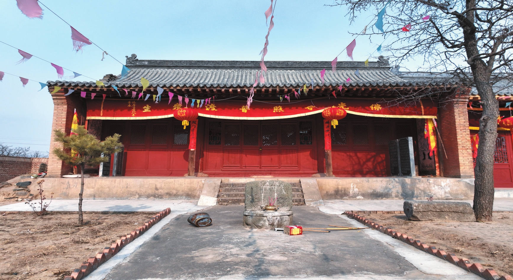 嘉圣寺位于代縣棗林鎮(zhèn)顯旺村北,創(chuàng)建年代不詳。據(jù)過殿題記載,明正德十六年(1521)重修。該寺坐北朝南,占地面積3295平方米,三進院落布局,中軸線上依次建有戲臺、過殿和正殿,兩側為東西配殿。過殿和正殿為明代建筑,其余皆為清代遺構。過殿為石砌臺基,基寬11.2米、深9.3米、高1.3米,面寬三間,進深四椽,單檐懸山頂,五檁無廊式構架,裝修已毀。正殿為石砌臺基,基寬11.3米、深9米、高0.9米,面寬三間,進深五椽,單檐硬山頂,六檁前廊式構架,前檐明間和次間施四扇六抹格扇門。