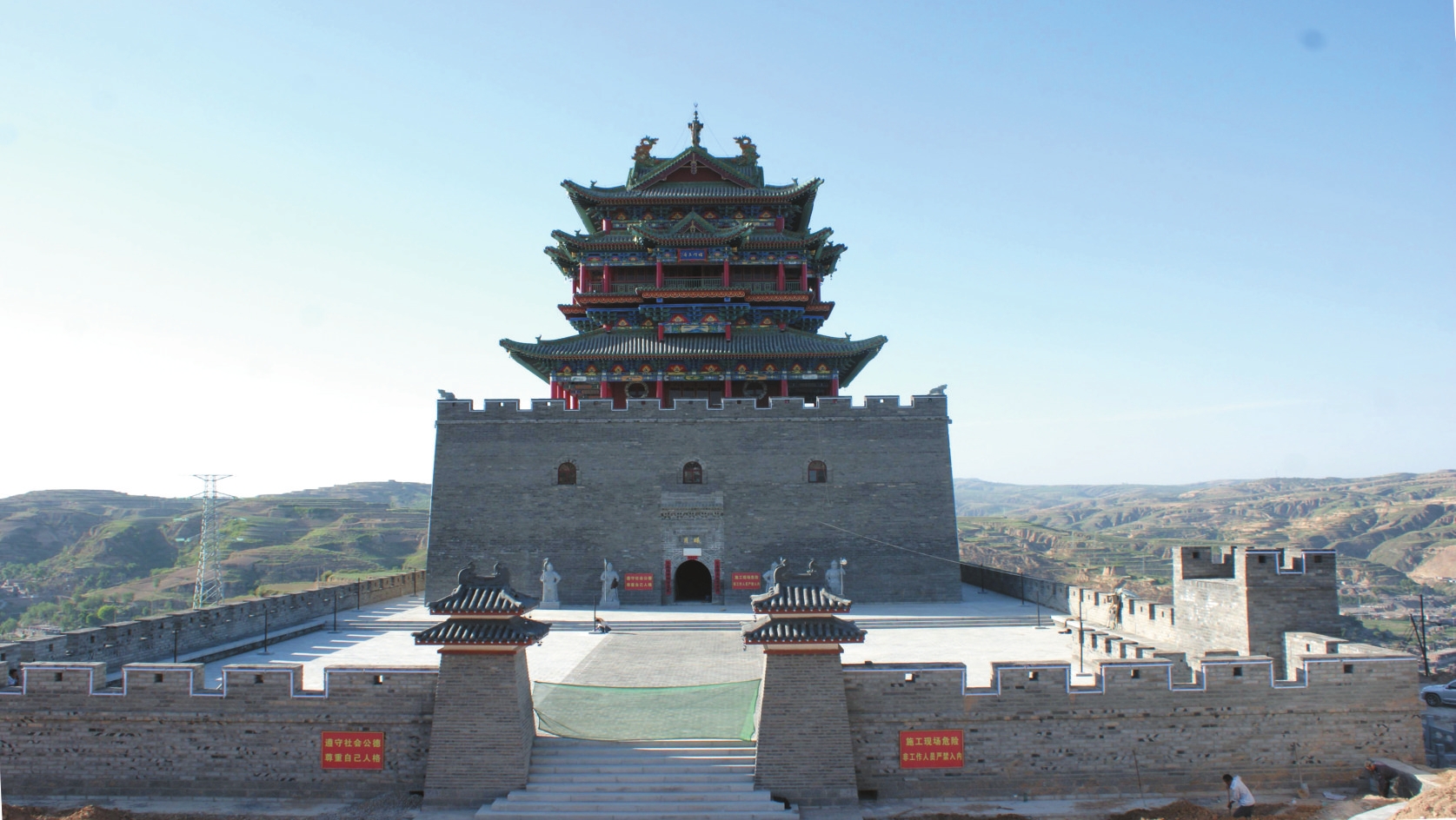 2011年至2012年,護(hù)城樓于原址復(fù)建為鋼筋混凝土仿古建筑。新建城堡南北長70米、東西寬36米,堡東開一拱門,外包磚,內(nèi)填素土并夯實(shí),城墻上砌筑垛口。護(hù)城樓為方形,通高28.8米,其中墩臺高12米、寬28米;樓身高19米、寬20米。