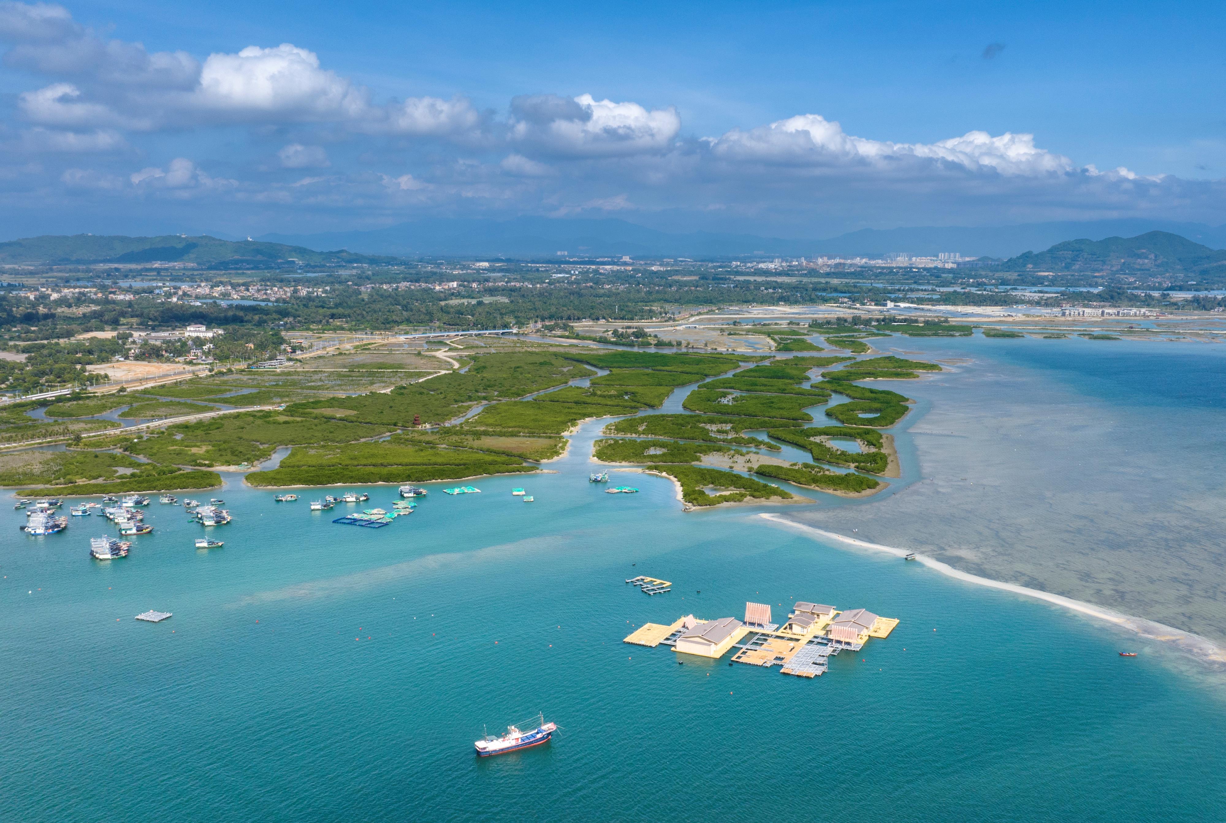 △海南陵水紅樹林國家濕地公園。紅樹林素有“海岸衛(wèi)士、鳥類天堂、魚蝦糧倉”的美譽,在凈化海水、防風(fēng)消浪、維持生物多樣性、固碳儲碳等方面發(fā)揮著極為重要的作用。