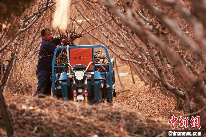 桃農(nóng)將修剪的樹(shù)枝裝車(chē)運(yùn)回。高新生 攝