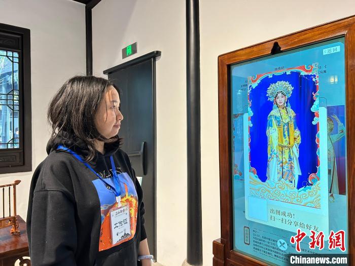 近期,蘇州古城32號街坊的江蘇按察使署舊址舉辦“匠海拾遺—沉浸式名城非遺文化體驗(yàn)展”。圖為工作人員展示昆曲AI換臉拍照體驗(yàn)過程。國璇 攝