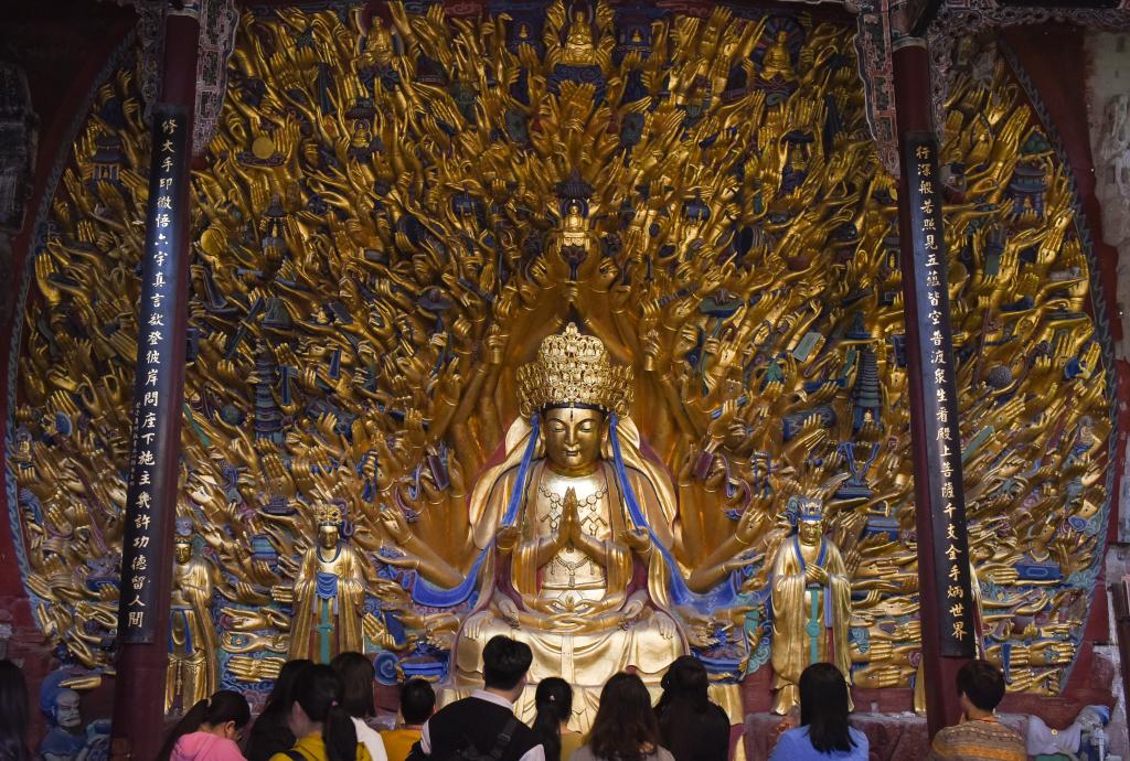 1952年,大足石刻文物保護機構(gòu)成立,開始系統(tǒng)科學(xué)保護大足石刻。當(dāng)年,北山石刻保護長廊啟動建設(shè),北山石刻上方加蓋了擋雨的頂棚;1961年,北山、寶頂山摩崖造像成為第一批全國重點文物保護單位;1999年,大足石刻被列入《世界遺產(chǎn)名錄》;2015年,全國石質(zhì)文物保護一號工程——大足石刻千手觀音造像搶救性保護工程竣工;2019年,《大足石刻全集》出版,填補了國內(nèi)石窟寺編寫出版大型考古報告的空白……