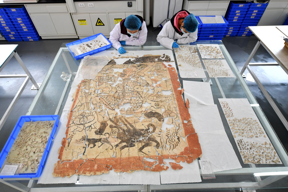 在云岡研究院壁畫(huà)文物修復(fù)室,工作人員張曉娟(左)、吳朝霞在進(jìn)行壁畫(huà)修復(fù)(2021年5月9日攝)。