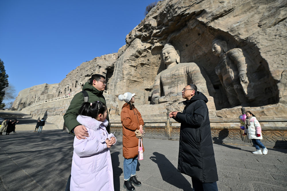 在山西大同云岡石窟,云岡研究院院長(zhǎng)杭侃(右)在給游客講解石窟的歷史知識(shí)(2024年2月25日攝)。
