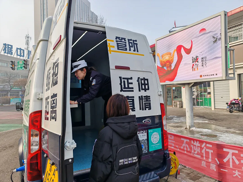 春節(jié)假期,城市、鄉(xiāng)村到處都彌漫著歡樂祥和的氣氛,初一至初七,在山西省忻州市忻府區(qū)光明西街古城北廣場、公園西街世紀花苑小區(qū)南門等人流量大、人員集中場所,忻州市公安局交警支隊的警郵車管便民服務車格外顯眼?!翱s短距離、延伸真情”,這輛承載著為駕駛?cè)颂峁崆橹艿椒?、為車輛安全出行提供保障,被群眾稱為“流動車管所”的車管便民服務車讓寒冬暖流涌動。