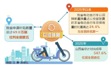 2025年以來,我省電動(dòng)自行車以舊換新置換量占公安部披露的本省電動(dòng)自行車總保有量的比重高達(dá)24.4%,在全國排名第一。以2025年全國建議工作量計(jì)算,山西省的總計(jì)劃完成率達(dá)到547.6%,位居全國首位。